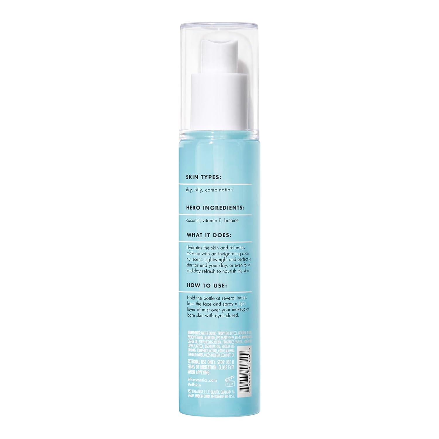 - LIGHT & REFRESHING: The e.l.f. Hydrating Coconut Mist is a lightweight, hydrating facial mist that moisturizes the skin and refreshes makeup.
