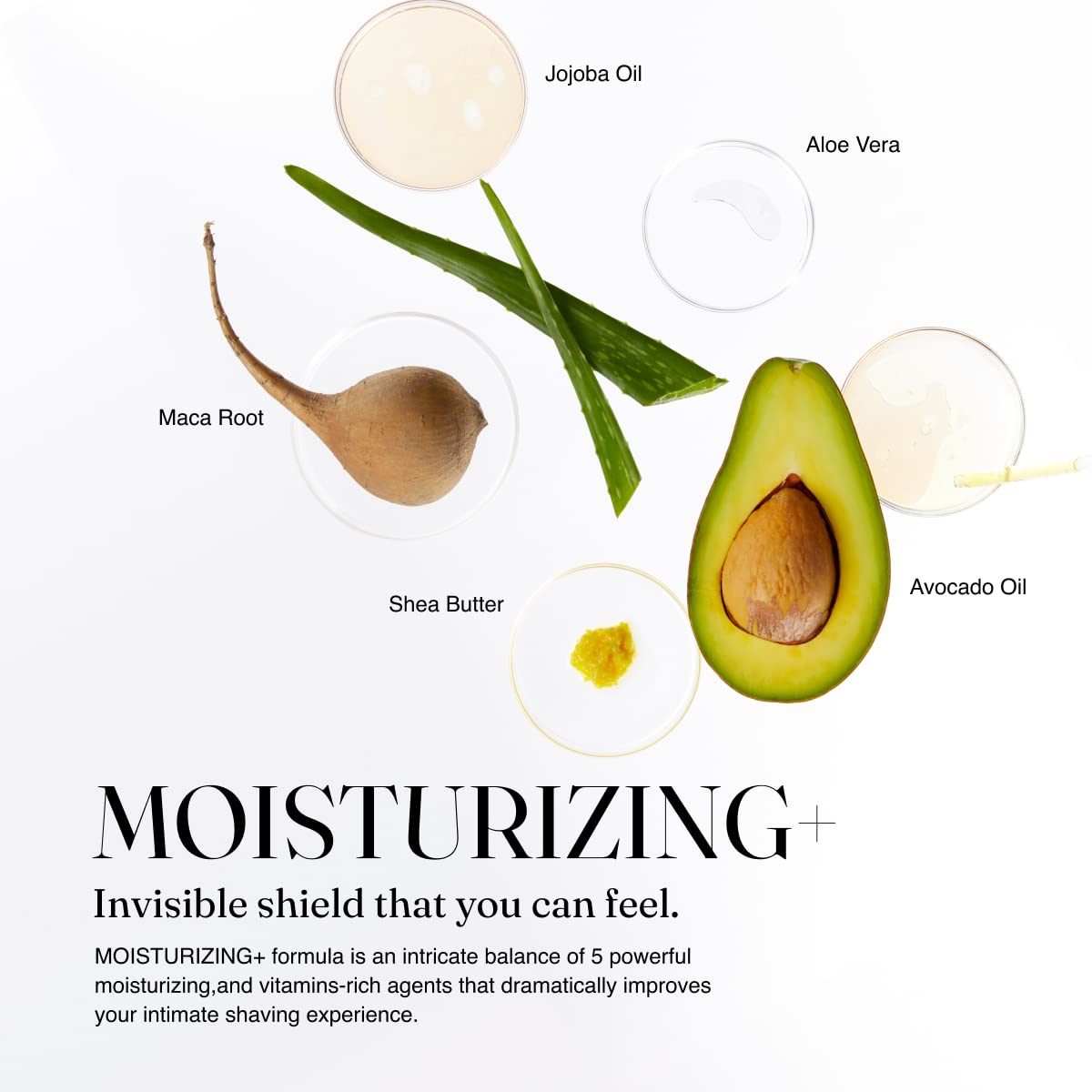 - MOISTURIZING+ FORMULA - Formulated with 5 powerful moisturizing, and vitamins-rich agents that dramatically improves your intimate shaving experience; Jojoba Oil / Avocado Oil / Aloe Vera / Shea Butter / Maca Root.