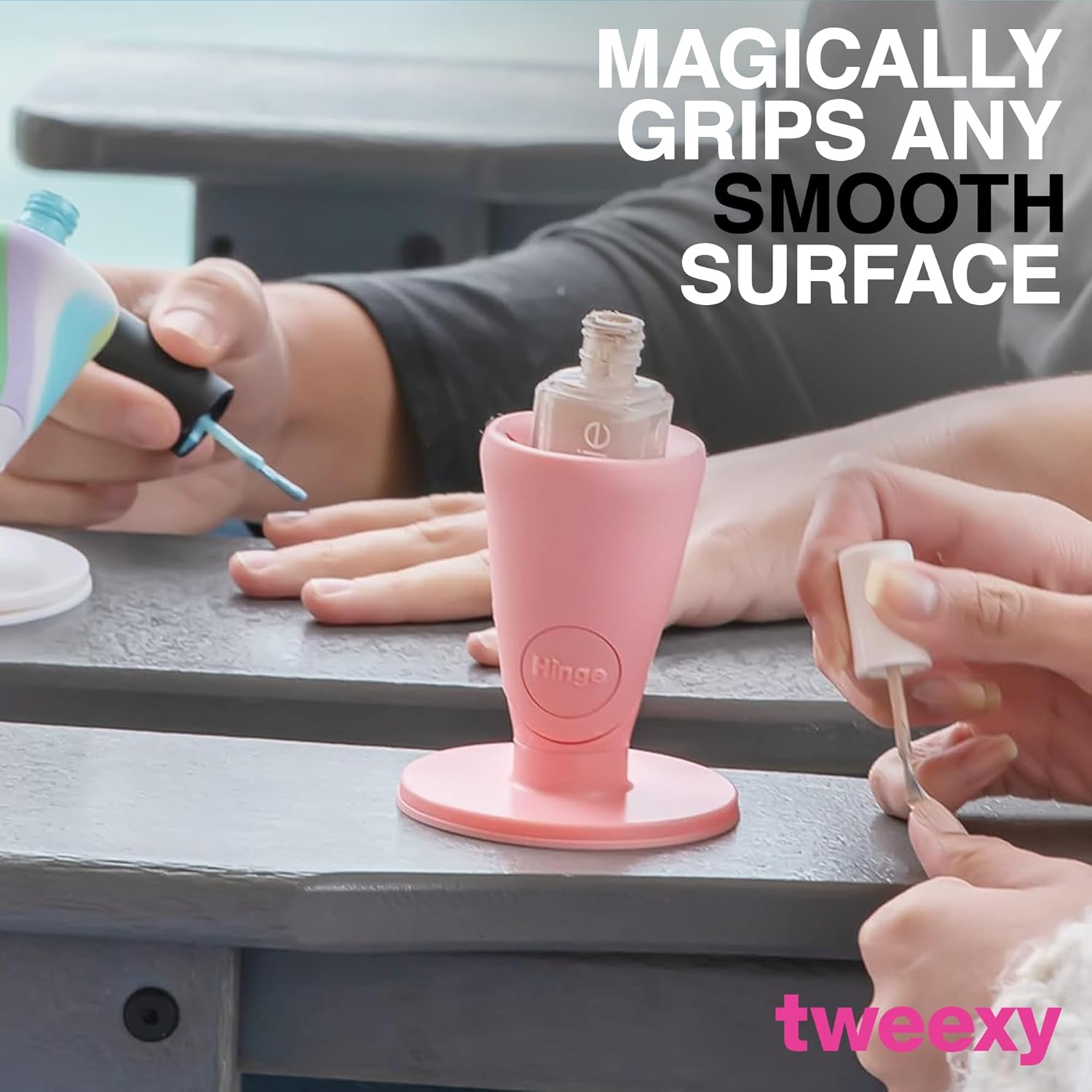 - IntelliStick TECHNOLOGY. The IntelliStick creates a low-pressure zone that holds it tightly to the surface, even vertically. A stray elbow or hand movement can’t knock it over, so your nail polish bottle holder stays front and center. To remove this centered force, lift your Tweexy Hinge nail polish holder stand straight upwards and the air-lock will release like magic.