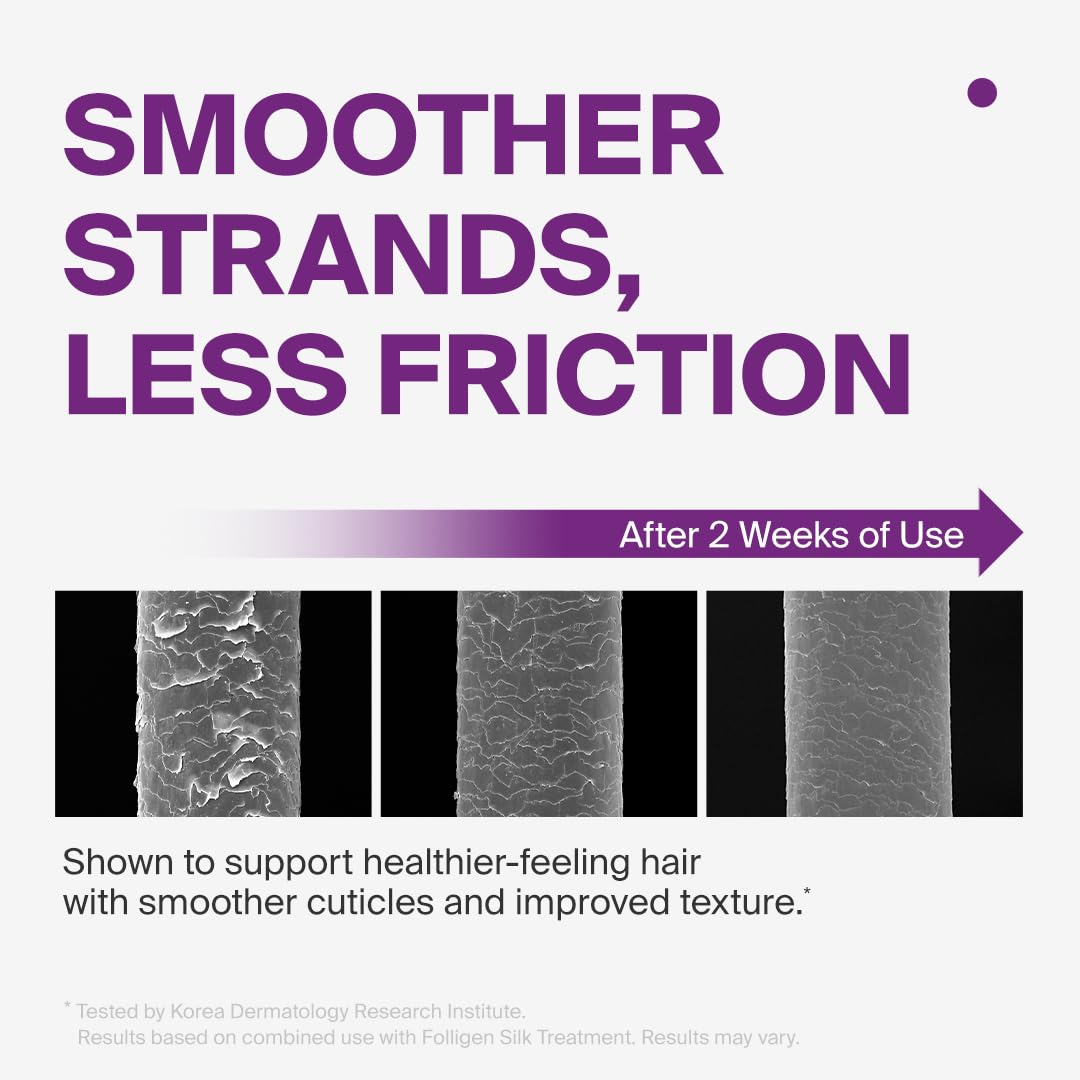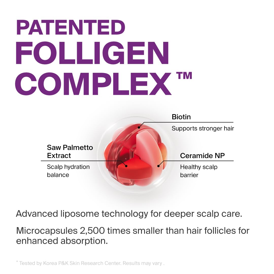 - Folligen Complex for Scalp Care: Our patented Folligen Complex supports scalp strength and elasticity while promoting thicker, fuller-looking hair. With particles 25,000 times smaller than pores, active ingredient absorption is maximized.