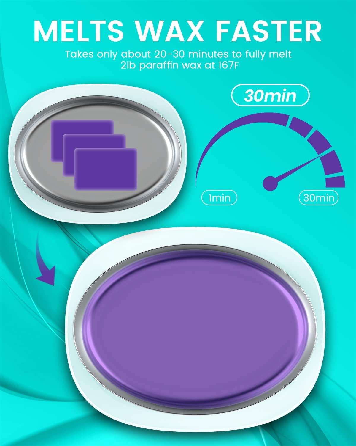 - Large Capacity / Quick Heat: paraffin wax machine has a large opening inner container , which offers you enough space to dip your hands, elbows or feet in paraffin warmer machine. Melts wax quickly and evenly , takes just 30 minutes to fully melt 2 lbs of paraffin wax at 167 °F. Turn Off the machine when dipping