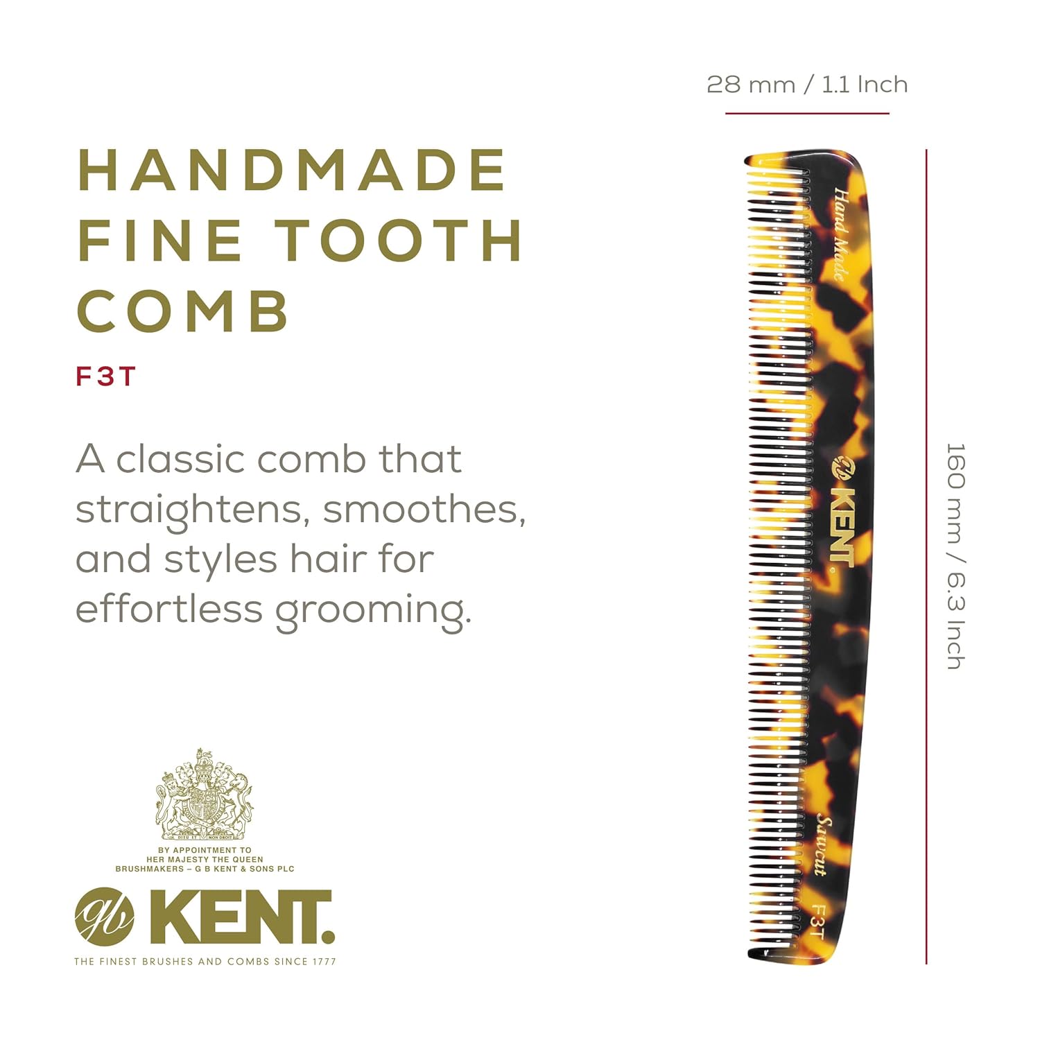 Kent F3T TY Fine Tooth Comb for Hair Parting, Handmade Combs for Men and Straightening Comb for Women, Dandruff Remover Kent Mens Combs for Fine Hair