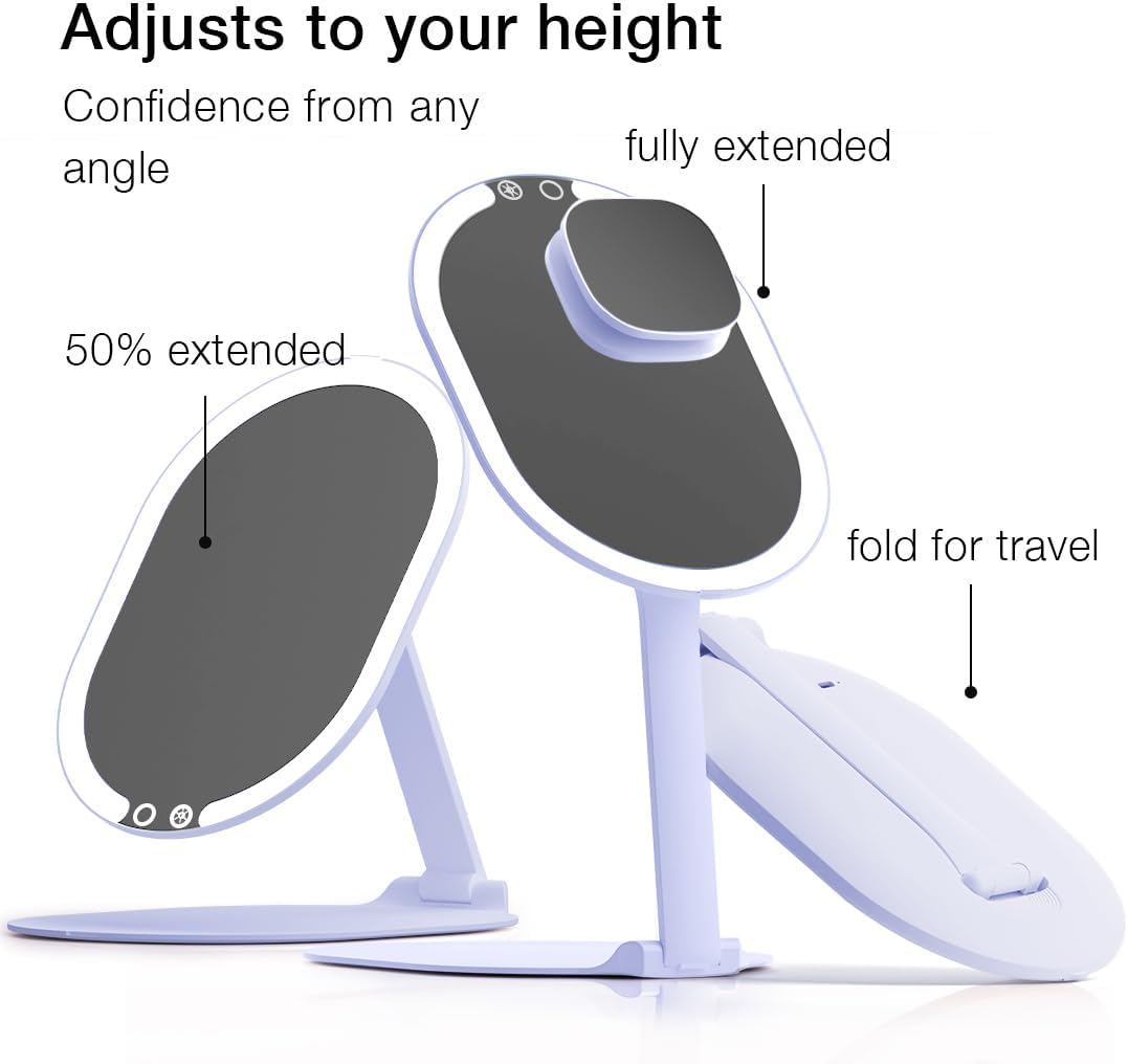 - Adjustable Height – Our travel mirror effortlessly transitions from handheld to vanity, allowing you to find the perfect viewing angle at various heights. No more uncomfortable hunching!