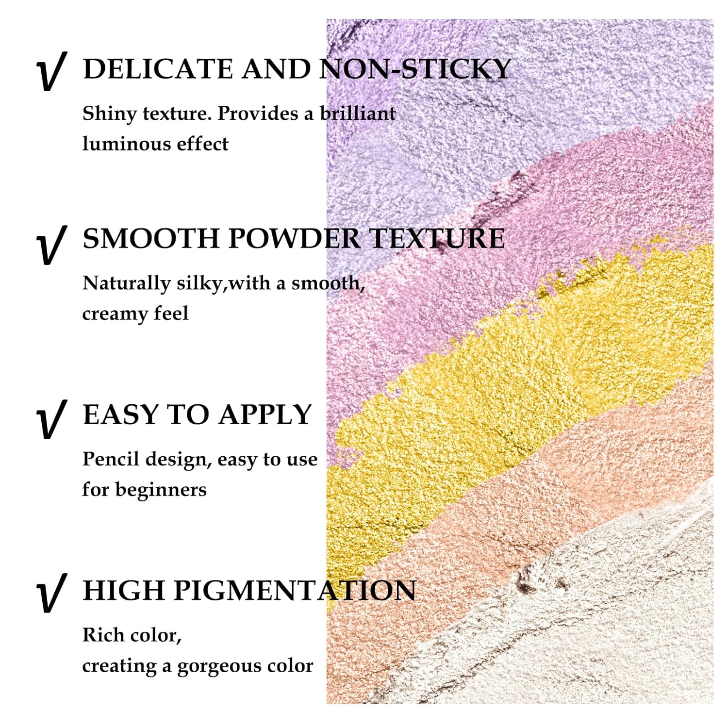 - Eye Highlighter Stick: Glitter Eyeshadow Pen has a shimmer color. You can easily apply a gradient look with it. Multiple colors for you to choose from to create different eye makeup.