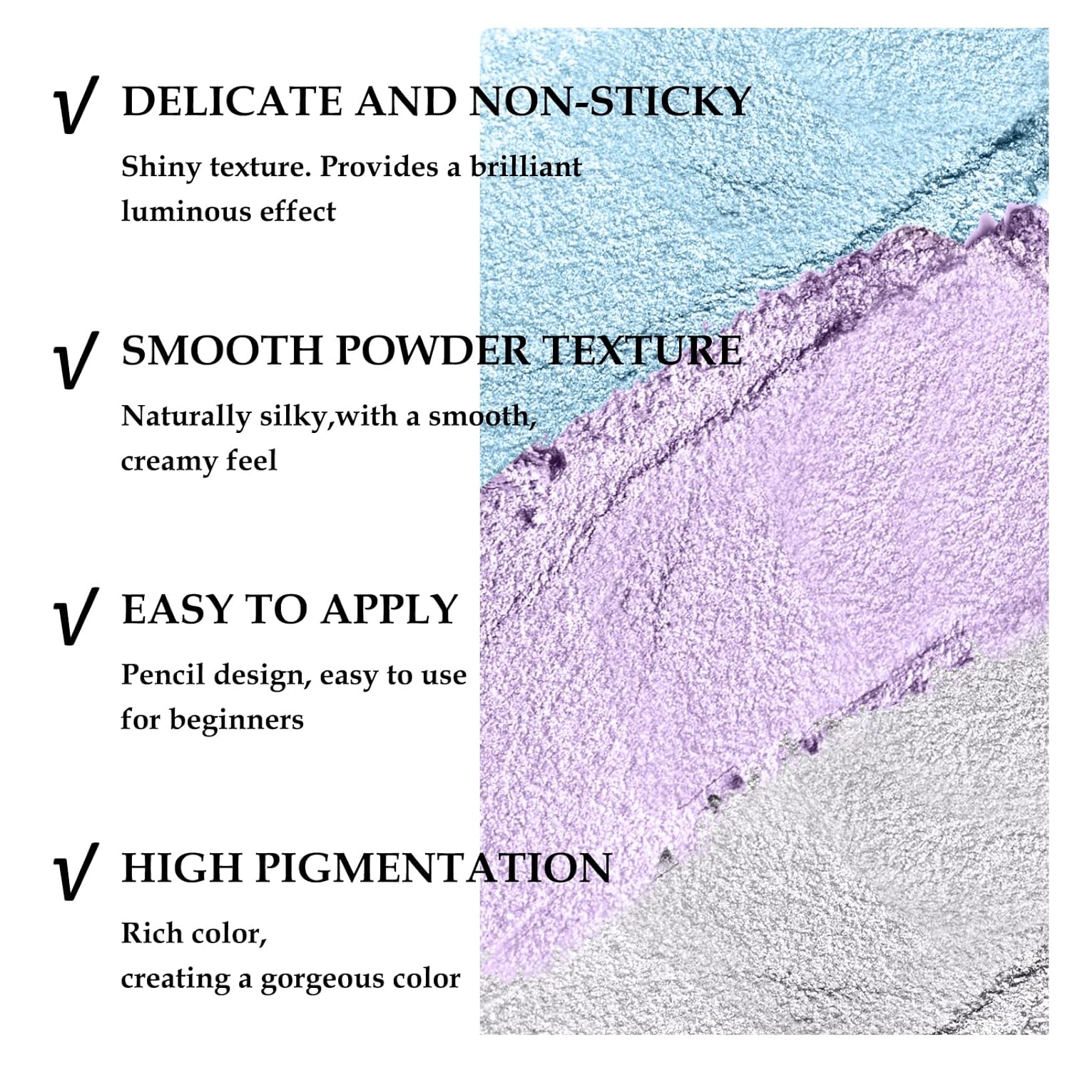 - Eye Highlighter Stick: Glitter Eyeshadow Pen has a shimmer color. You can easily apply a gradient look with it. Multiple colors for you to choose from to create different eye makeup.