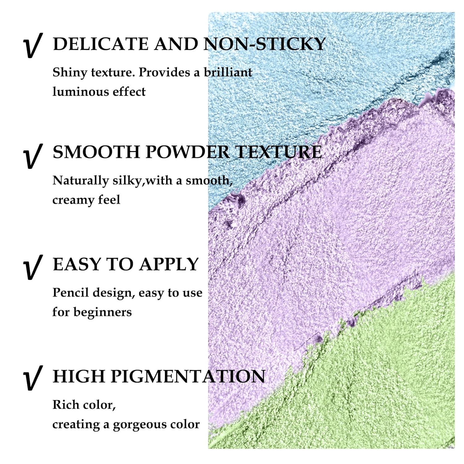 - Eye Highlighter Stick: Glitter Eyeshadow Pen has a shimmer color. You can easily apply a gradient look with it. Multiple colors for you to choose from to create different eye makeup.