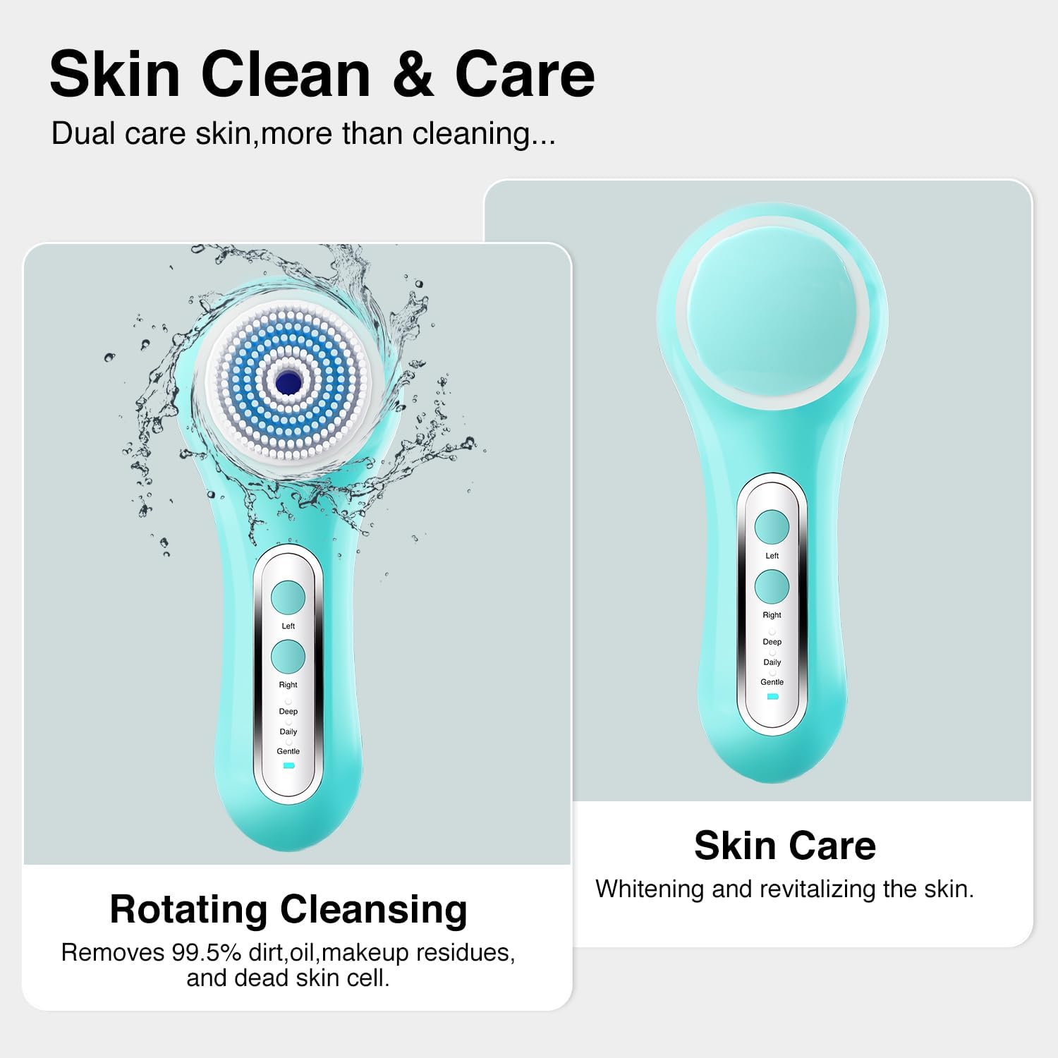 - Left & Right Rotation: This facial cleansing brush combine left and right spin cleansing way, provides more targeted cleaning mode. Left Rotation โ Deep Purge Mode,effectively removes acne and trapped debris (nose/chin)๏ผRight Rotation โ Daily Refresh Mode,Gentle yet thorough to Clears surface oil and impurities (cheeks/forehead).