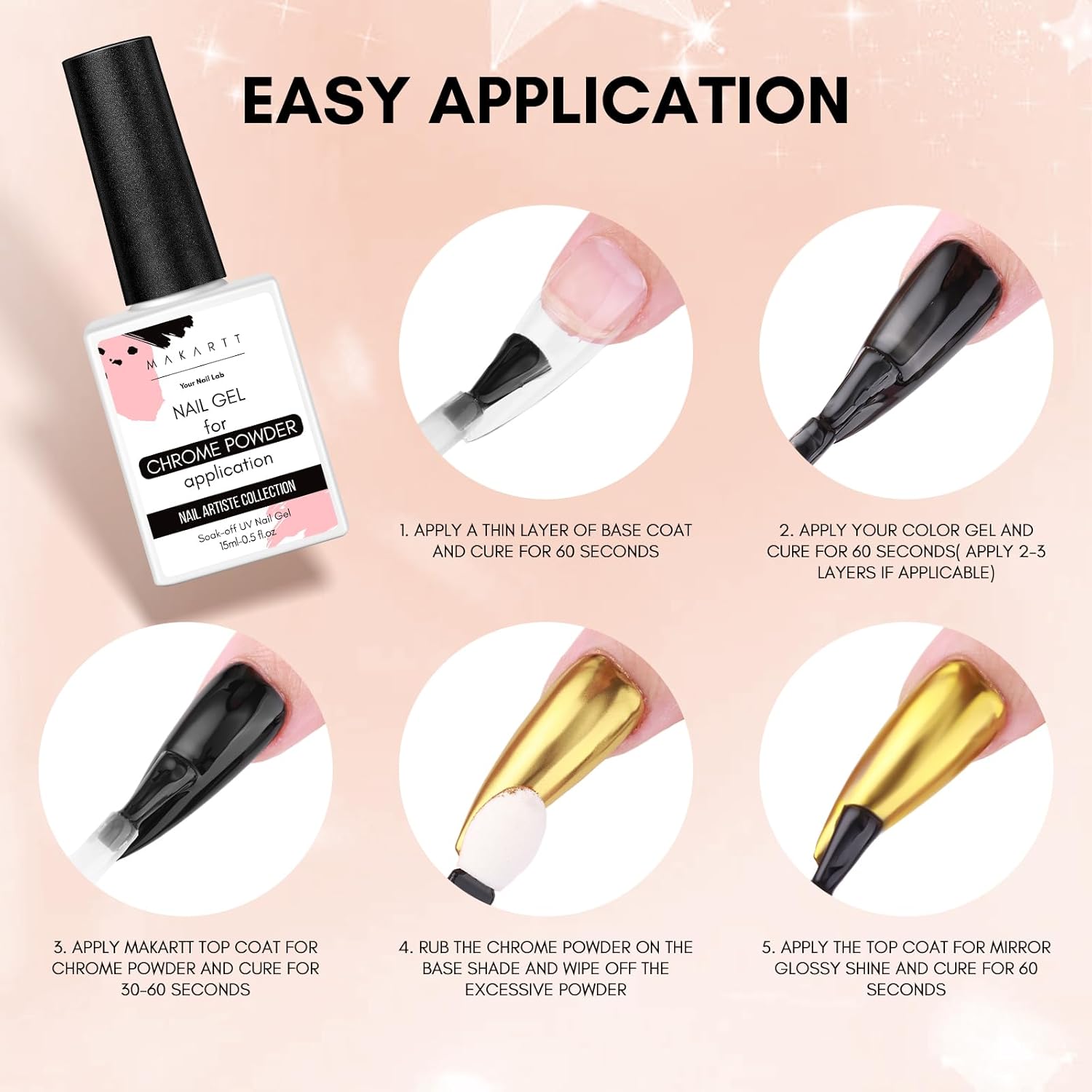 - Easy Application: Simply apply Makartt non-wipe gel top coat over your base color, cure for 30 seconds under an LED UV lamp, and then apply your favorite chrome or pearl powder. Finish by sealing with the top coat and curing under the lamp for 60 seconds to complete the look