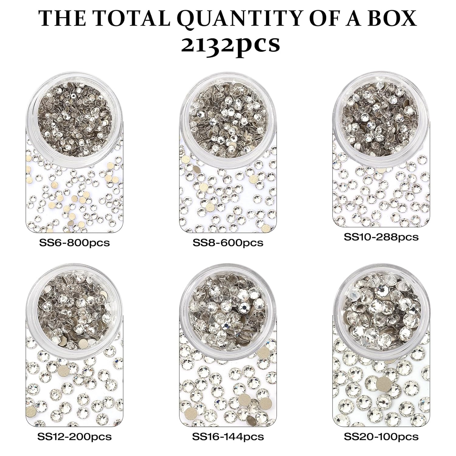 - Rhinestones: Pack of 2132 Pieces Crystal Clear Rhinestones, mixed 6 sizes, SS6 (1.9-2.0mm), SS8 (2.3-2.5mm),SS10 (2.7-2.9mm),SS12 (3.0-3.2mm),SS16 (3.8-4.0mm),SS20 (4.6-4.8mm).