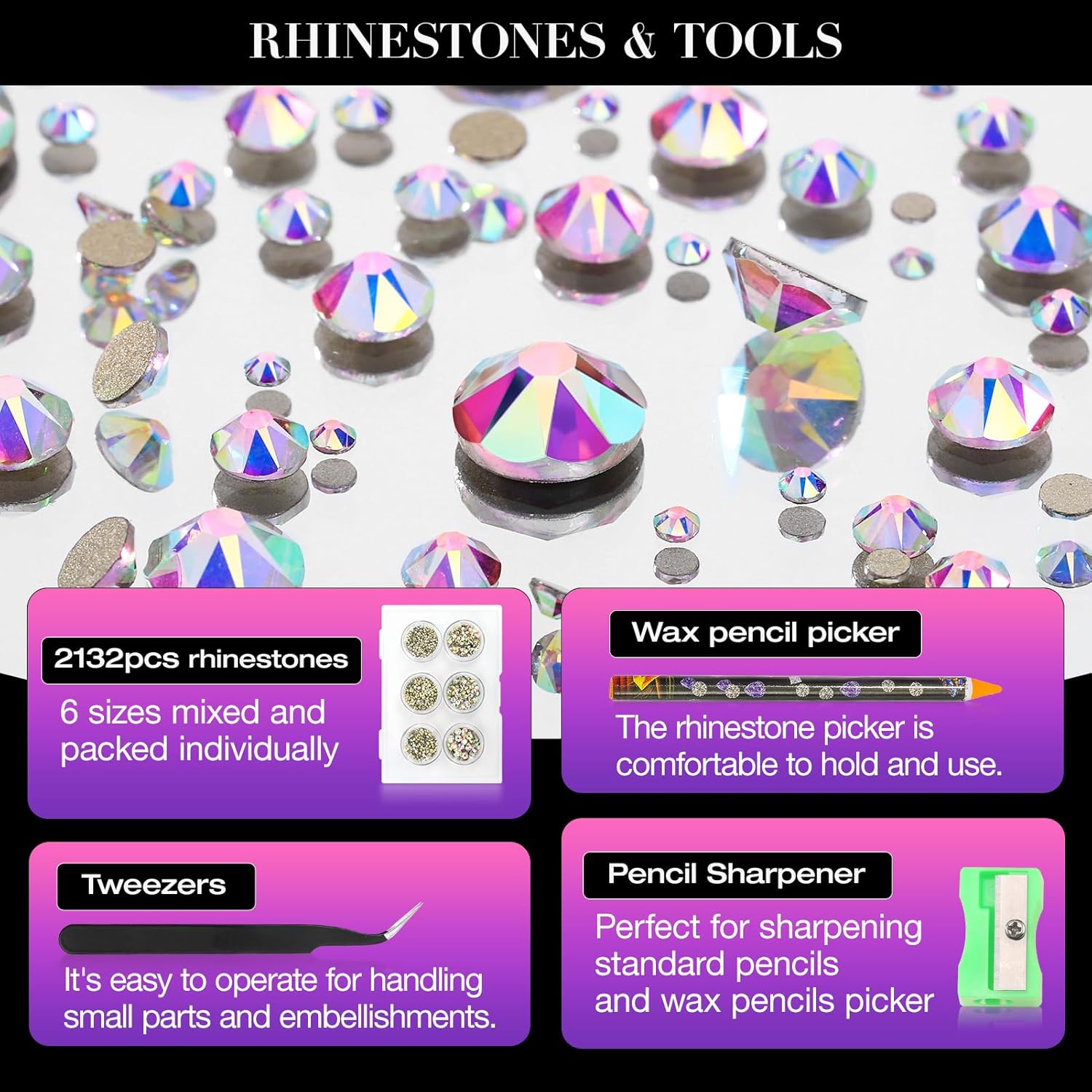- Rhinestones: Pack of 2132 Pieces Crystal AB Rhinestones, mixed 6 sizes, SS6 (1.9-2.0mm), SS8 (2.3-2.5mm),SS10 (2.7-2.9mm),SS12 (3.0-3.2mm),SS16 (3.8-4.0mm),SS20 (4.6-4.8mm).