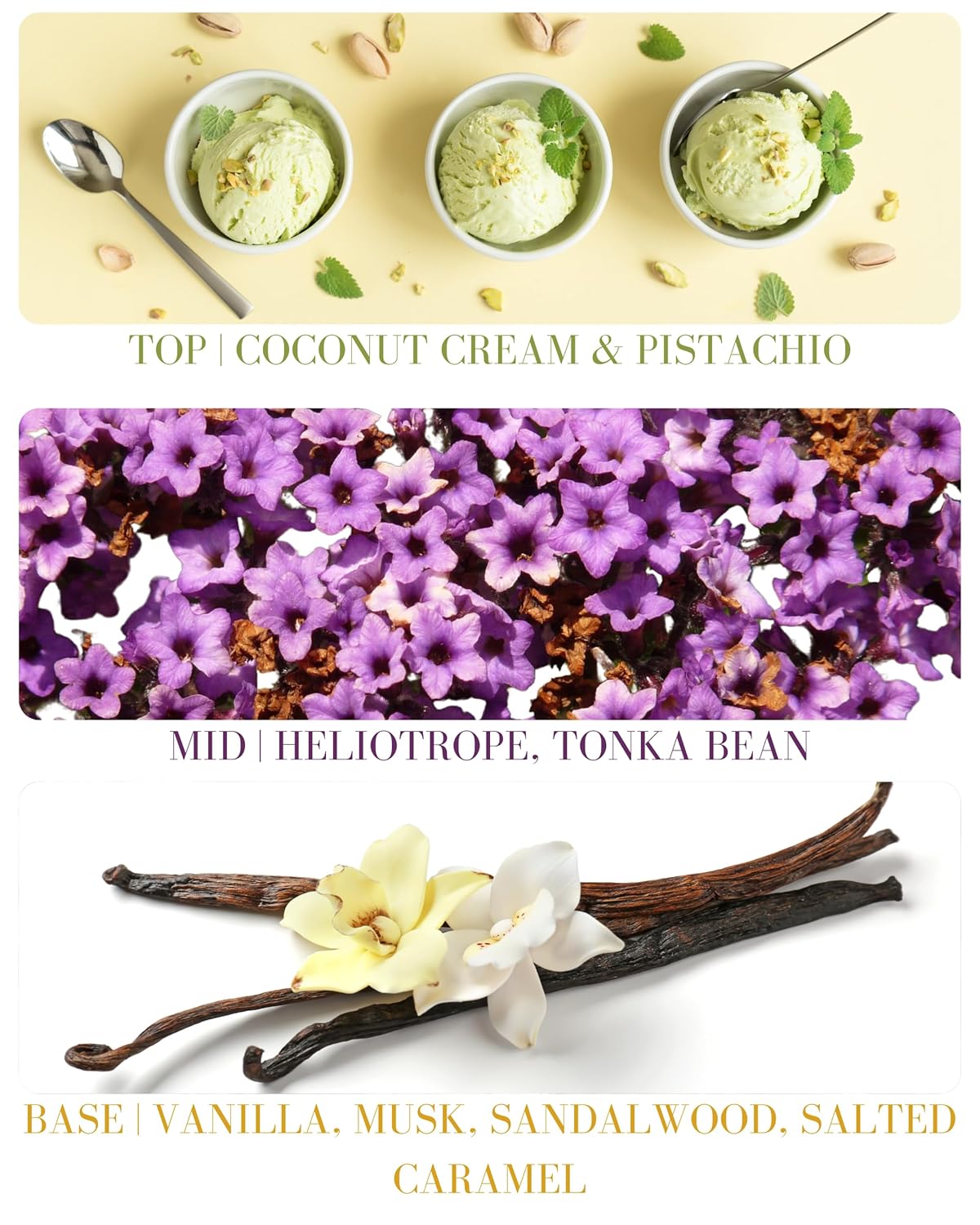 - SCENT PROFILE - TOP: Coconut Cream, Pistachio, MID:Tonka Bean, Heliotrope, BASE: Exotic Vanilla Musk, Sandalwood, Salted Caramel