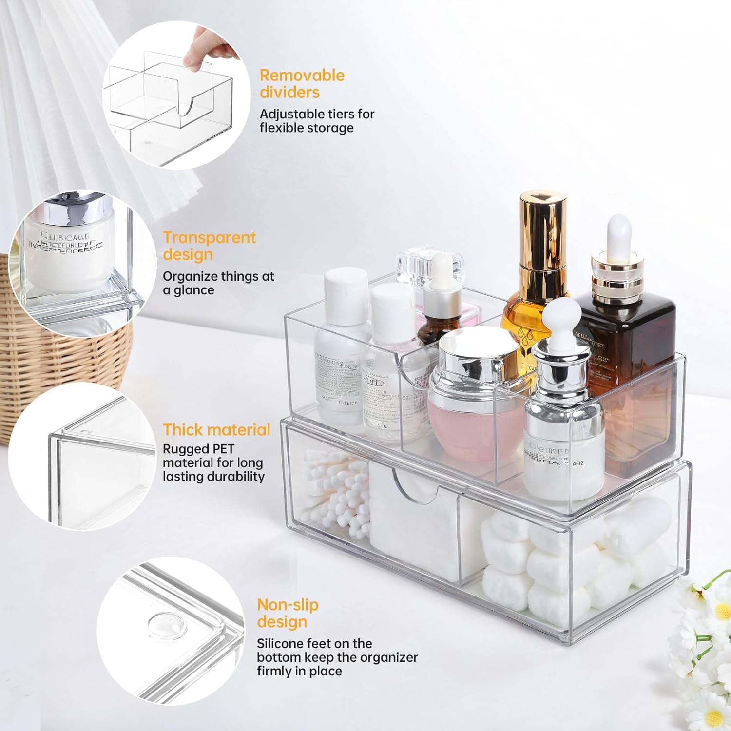 - Clever design: The stackable design of the box can reduce the space occupation and increase the storage efficiency; The drawer design is easy to access items; Anti-slip feet on the bottom to hold the box securely