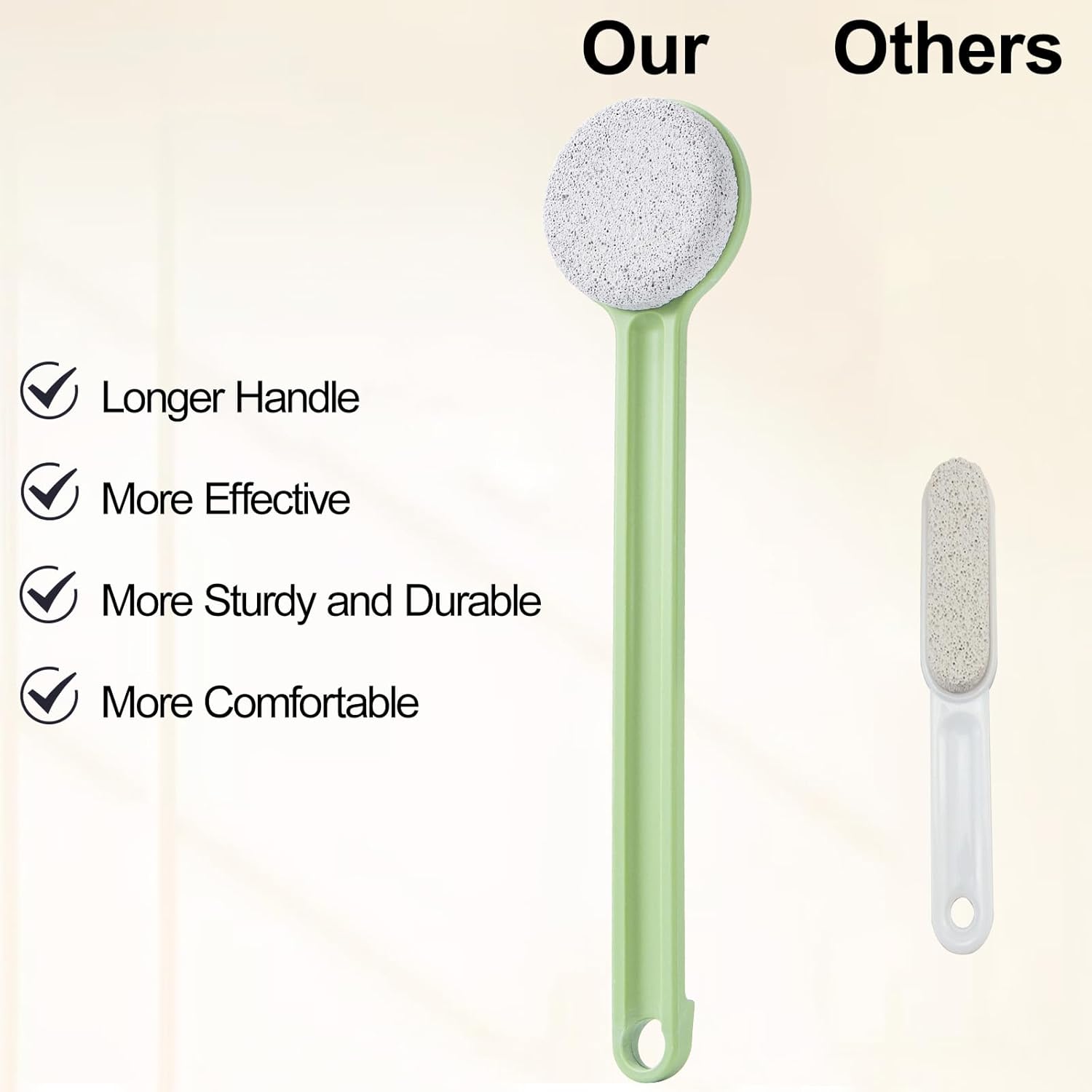 - Long Handle Design: The 14-inch long handle pumice stone allows for comfortable use and easy reach to the bottom of feet. It has a hanging hole for easy storage. Our foot pumices is a perfect gift for seniors, pregnancy and people with bacRelaxing Foot Spa: Use a foot pumice exfoliator tool twice a week to remove callus and dirt from the feet, making the skin smooth, relaxing, and enjoying foot care easilyk or legs pain etc.