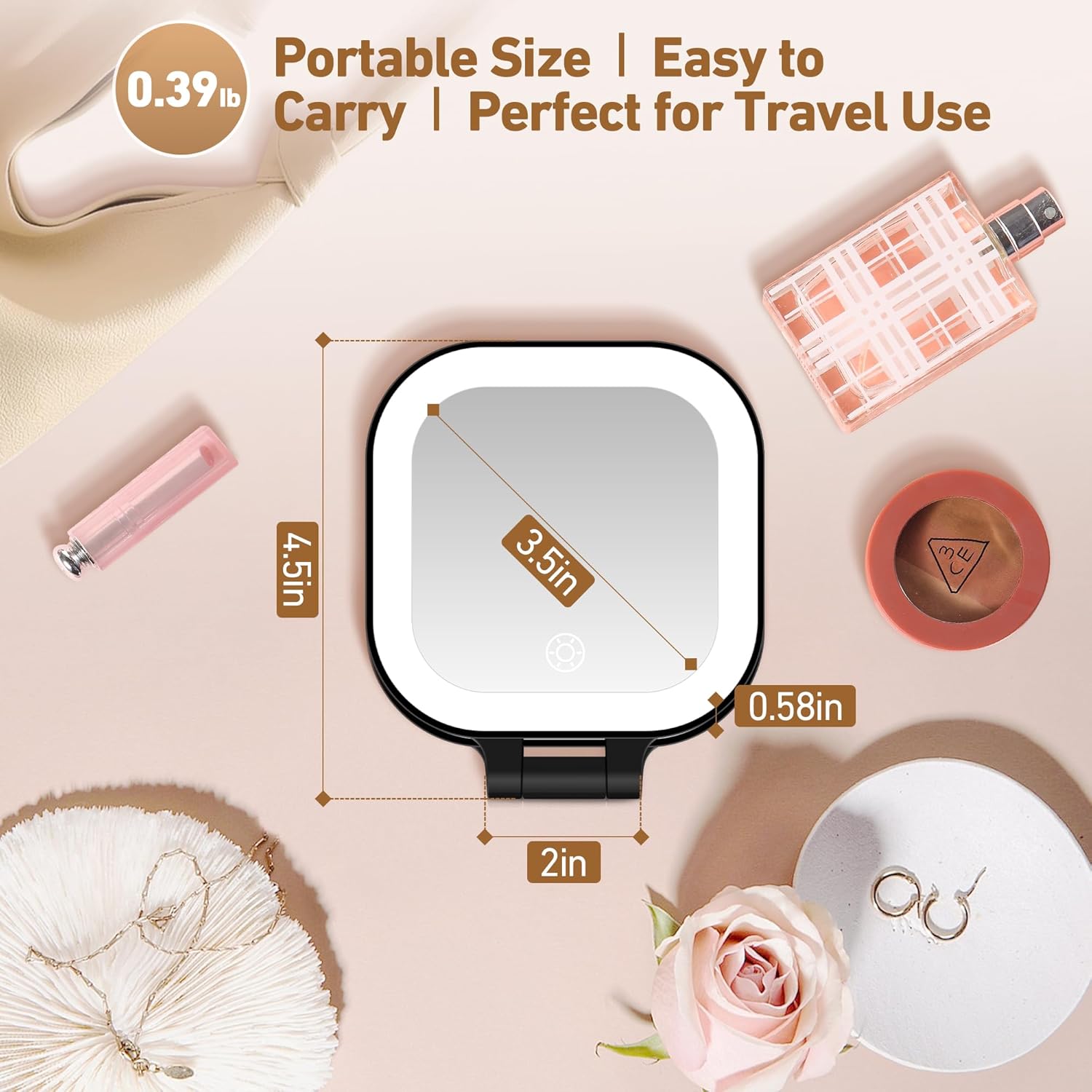 - Lightweight & Compact Travel Mirror: Weighing only 0.39lb, this compact magnifying mirror with light features a folding stand for stability. With its 4.56" length, 3.93" width, and only 0.58" thickness, this small mirror fits perfectly in purses, handbags, and luggage. The durable yet lightweight design makes it a travel essential mirror for all your makeup needs on the go
