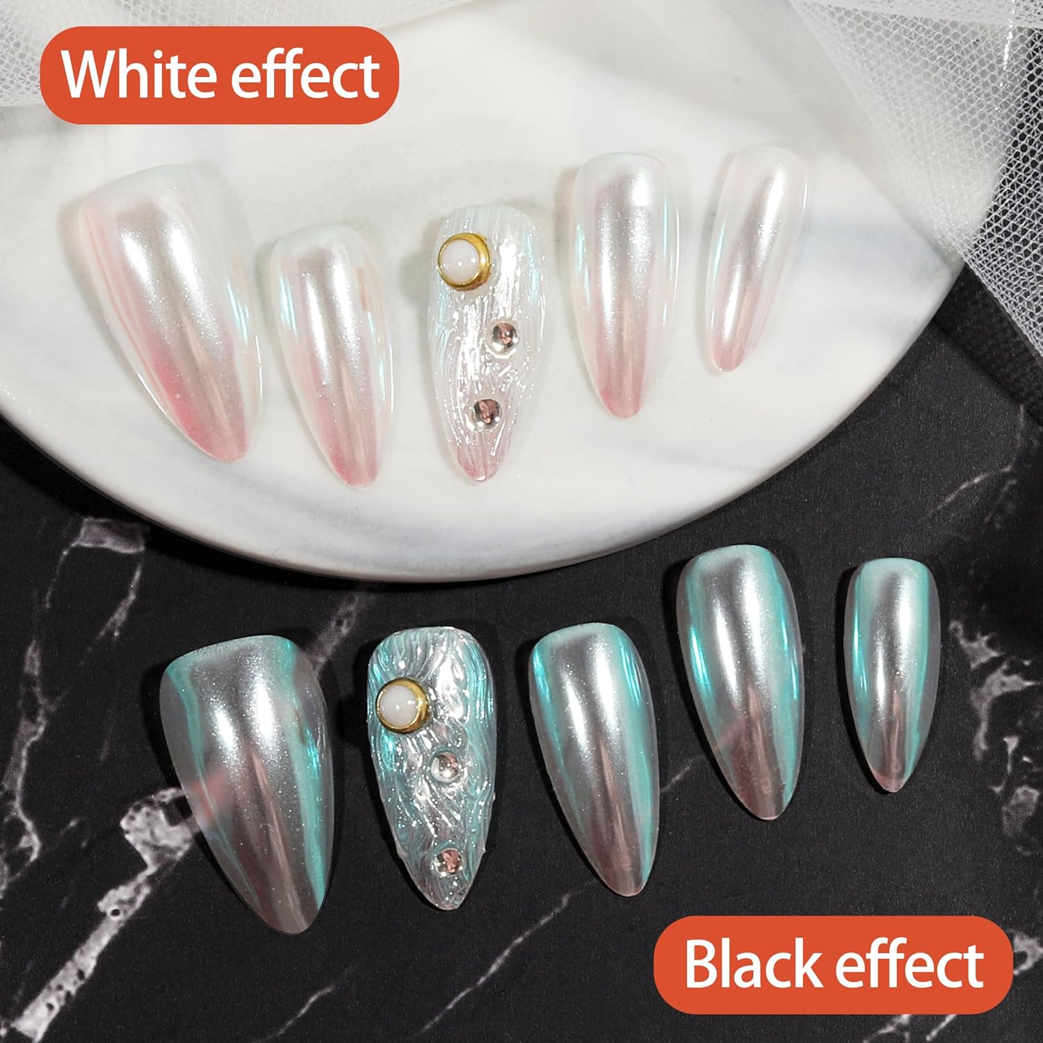 - 【PACKAGE CONTENTS】:1 PCS Marine aurora chrome nail pearl pigment powders. It needs to be used with gel nail polish and no wipe top coat. They can make many different design for your gel nail polish. It gives different color base a pearly shine for your nails