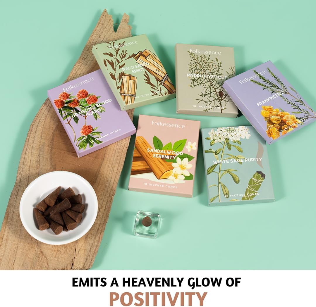 Folkulture Incense Cones Scented | Set of 6 (60 Cones) Pack for Relaxation | Palo Santo, Frankincense, White Sage, Sandalwood Inscents for Gifts for Her | Incense Cone Variety Pack