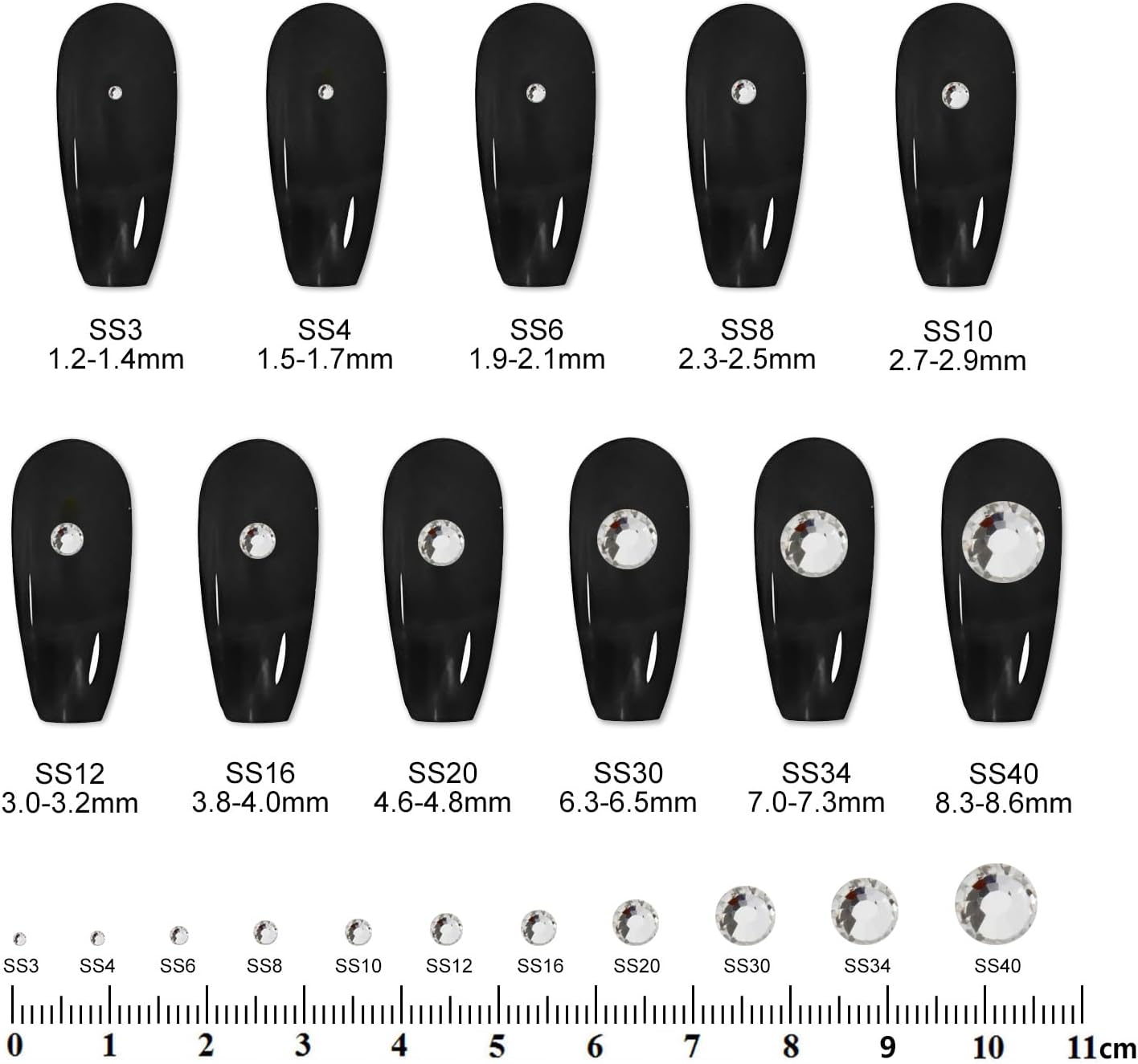 - ** How to choose the right size ** Smaller sizes such as SS6/SS8/SS10/SS12 are tiny,and more suitable for nail art, while larger sizes such as SS16/SS20/SS30 are grate for crafts. See size chart in images. Note: each size sold separately