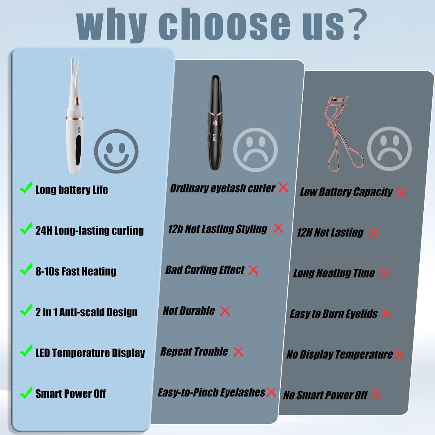 - Adjust Temperature Mode - Our heated eye lash curler comes with 3 temperature settings from 150ยฐF to 190ยฐF to gently curl your lashes and create stunning curls for amazing curling effect for different types of eyelashes, will not frizzing or pinching them